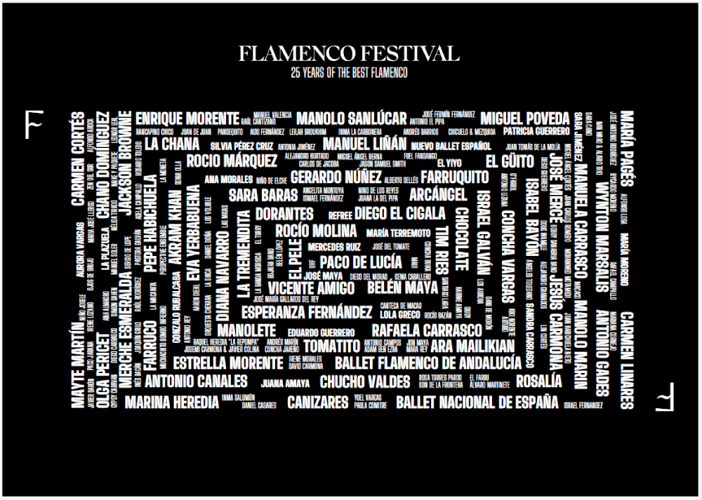 Flamenco Festival es un evento único como gran altavoz internacional del flamenco, que ha ofrecido hasta la fecha 1.400 representaciones y presentado a 180 artistas en 120 ciudades, de la mano de todos los grandes nombres del flamenco de los últimos 25 años. Figuras en lo más alto de sus carreras como Sara Baras, Miguel Poveda, Eva Yerbabuena, Estrella Morente, Carmen Linares, Vicente Amigo, Manuel Liñán, María Terremoto, Tomatito, María Pagés, Manuela Carrasco, Israel Galván, Carmen Cortés, José Mercé, Rocío Molina, Olga Pericet, Rocío Márquez, Rosalía, Mercedes Ruiz, Farruquito o Rafaela Carrasco, entre muchos otros, y auténticos genios y leyendas universales que han hecho historia ya no están entre nosotros, como Paco de Lucía o Enrique Morente.